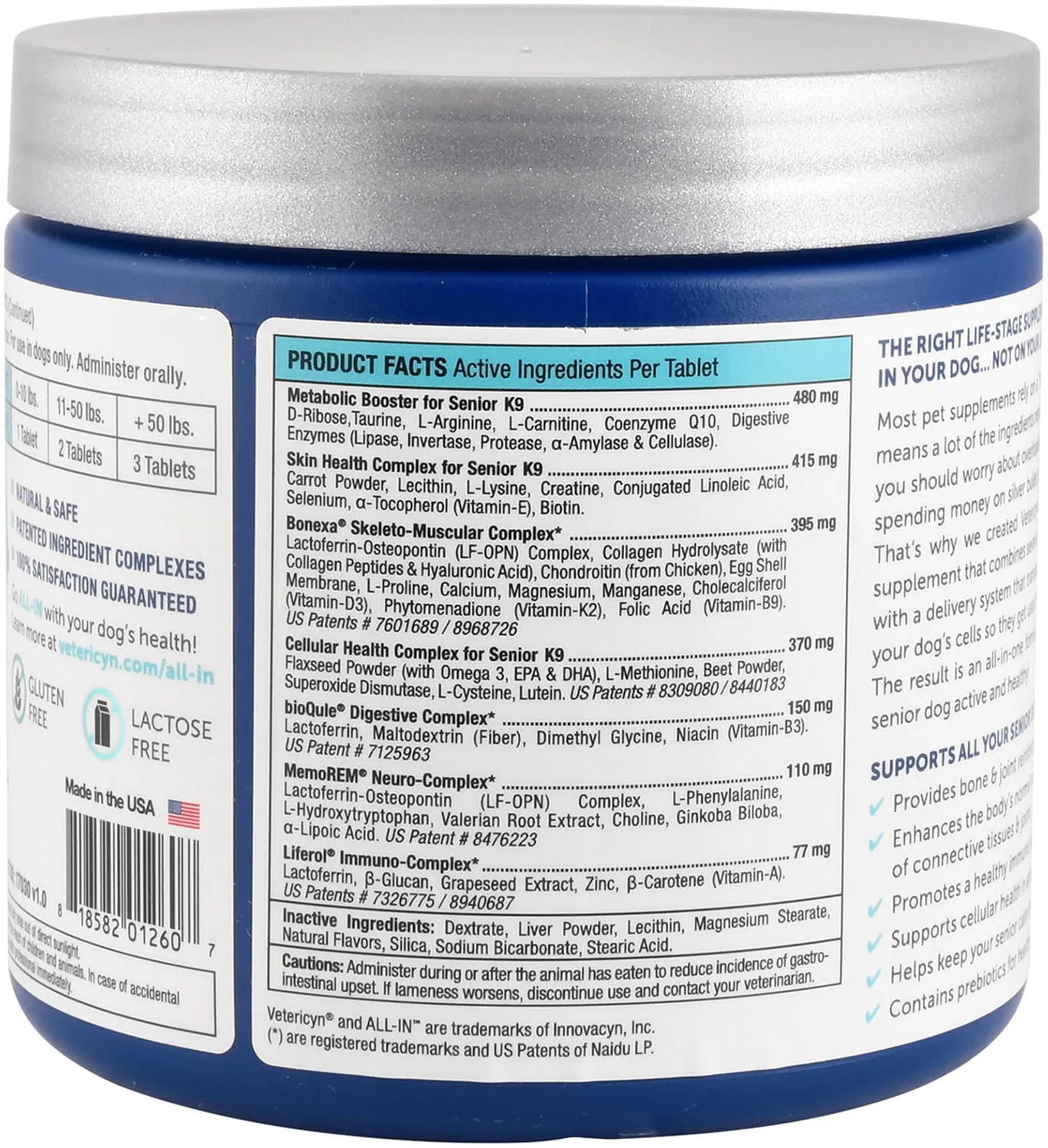 Vetericyn ALL-IN Senior Formula is the only life-stage supplement that combines age-specific, patented complexes. It's complete and balanced bio-replenishment, all in one tablet. Senior Formula promotes mobility and joint health, maintains strong bones, and enhances cardiovascular function. Formulated for dogs 7 years and older. Made in the USA.