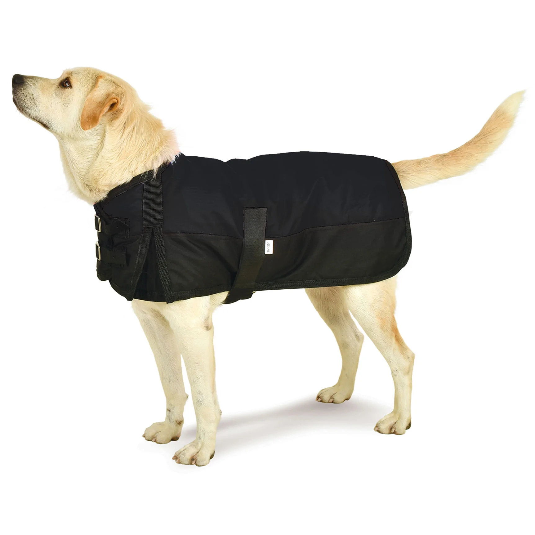 Jeffers' Best Winter Dog Coat. 600D poly ripstop shell with 200g poly fiber-fill insulation and nylon inner lining. This beautiful and sturdy dog blanket has a buckle front, adjustable belly wrap with quick grip hook & loop closure, and shoulder gussets to allow free movement.