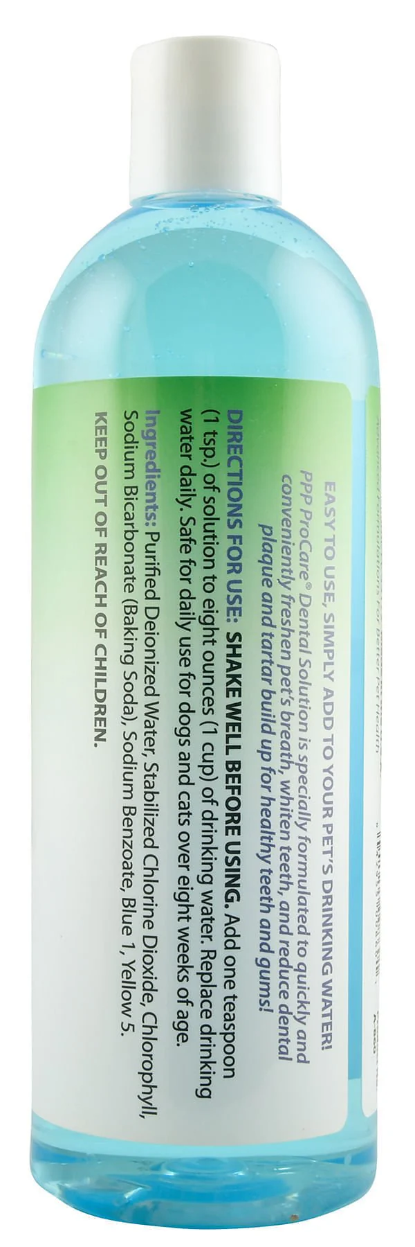 ProCare Dental Solution is specially formulated to freshen your pet's breath, whiten teeth, and reduce plaque and tartar buildup—quickly and conveniently. Simply mix with your pet's drinking water for daily oral care support. Suitable for dogs and cats over 8 weeks of age.