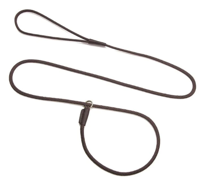 Hand-crafted in the USA with soft, pliable 1/8" diamond braid with adjustable leather stop. Won't mat hair or fur and keeps the focus on the dog yet strong enough to control when needed. Features a bright brass ring for an added exquisite look. Overall length of 6 ft.