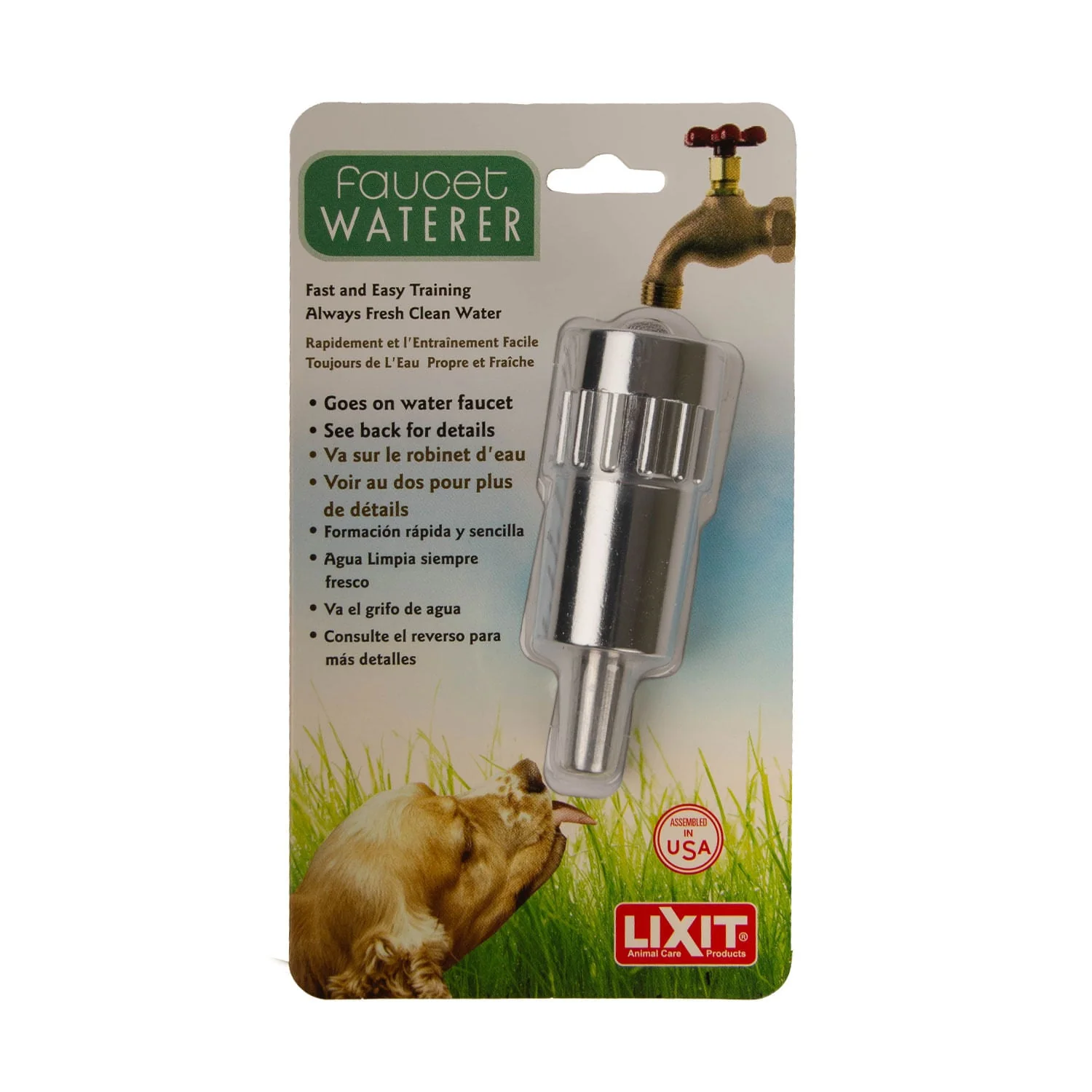 The Lixit L-100 Dog Faucet Waterer is an automatic dog waterer that connects directly to a standard outdoor faucet, garden hose, or 1/2-inch pipe fitting. It provides a tongue-activated flow of fresh water and shuts off automatically when not in use. This design helps conserve water while giving dogs constant access to hydration.